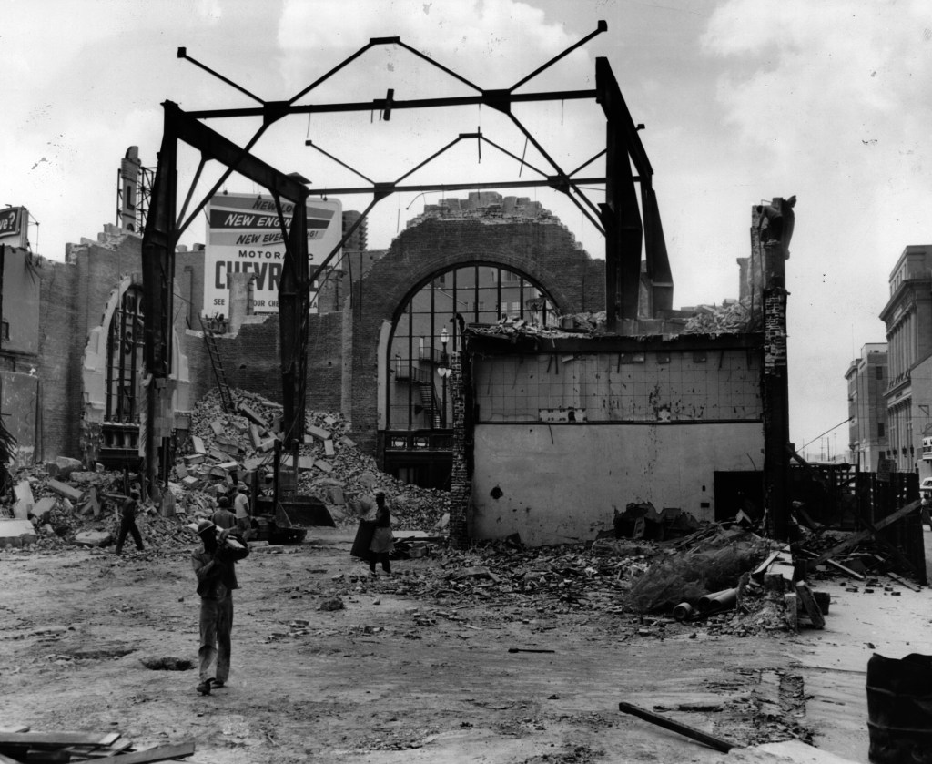 Even without Storyville, the trains still ran at the Southern Railway Terminal — for a while, anyway. But increased automobile ownership dramatically altered the transportation landscape, as evidenced by the Chevrolet billboard looming tyrannically over the demolished station in the photo.