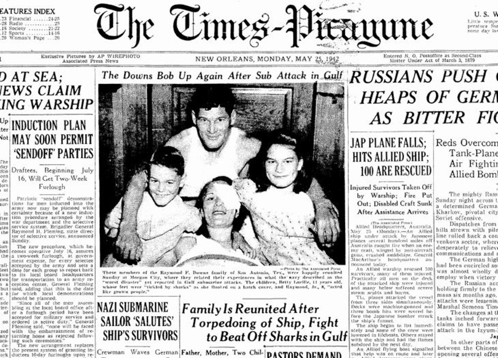 That didn’t stop an enterprising reporter from showing up at the Downses’ Morgan City hospital room and interviewing them about their ordeal less than a week after the sinking of the Heredia. The resulting story — along with a picture of the smiling, reunited Downs family — appeared on the front page of The Times-Picayune on May 25, 1942.