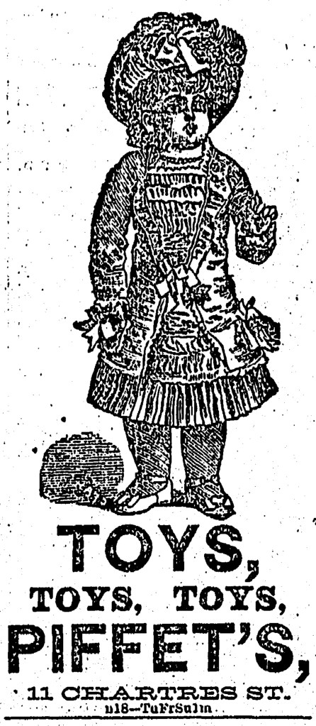 In truth, Piffet’s sold much more than just toys. Over the years, it referred to itself in advertisements variously as “B. Piffet’s Great Variety Store” (1853), “B. Piffet’s Grand Bazaar” (1865) and “Southern Emporium at B. Piffet’s” (1871).
